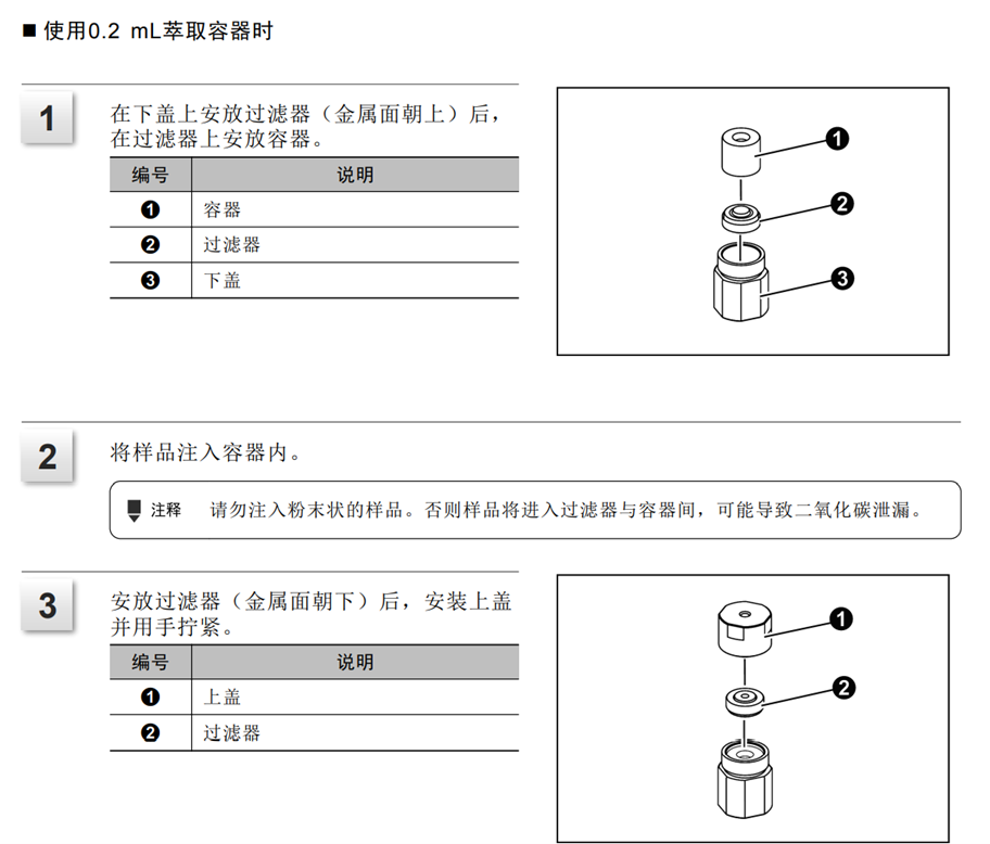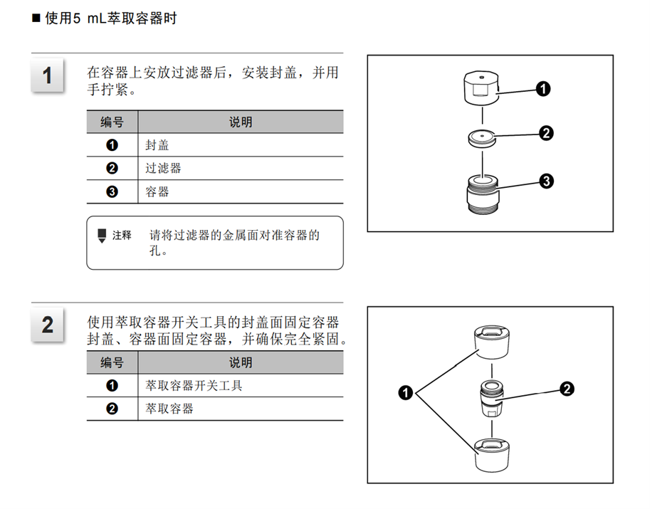 萃取容器安裝方式有兩種:使用萃取容器開關工具或者擴展組件(萃取容器開閉組件固定臺)兩種方式,無論使用哪種方式安裝萃取容器都應注意以下幾點: