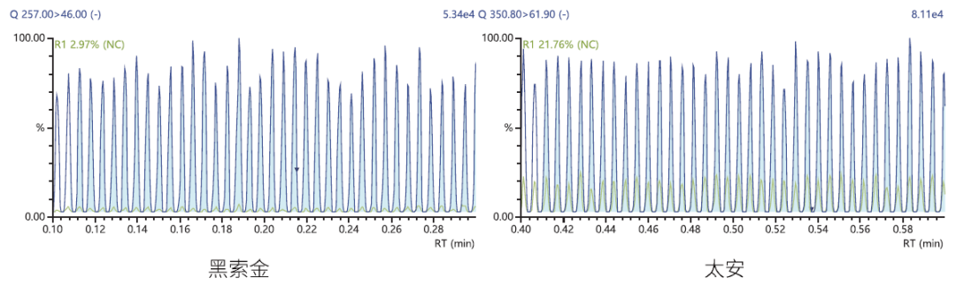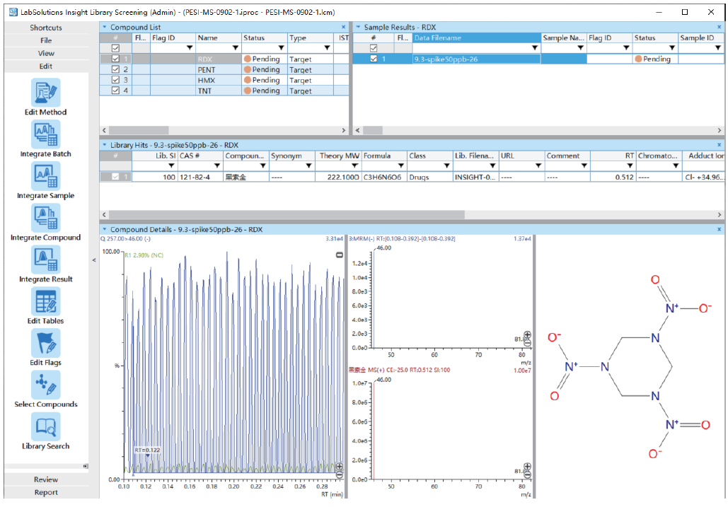 內(nèi)容介紹:DPiMS技術(shù)能夠脫離對(duì)于色譜分離的依賴,實(shí)現(xiàn)對(duì)于不同形態(tài)樣品的快速直接測(cè)定?;贒PiMS-8060的MRM模式建立多產(chǎn)物離子質(zhì)譜數(shù)據(jù)庫,對(duì)于土壤中爆炸殘留物進(jìn)行快速定性分析。方法學(xué)驗(yàn)證結(jié)果良好,通過軟件譜庫搜索功能,對(duì)于爆炸殘留物的4種爆炸物進(jìn)行定性篩查,目標(biāo)匹配度良好。