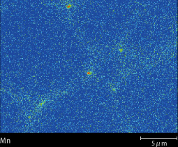使用1μA束流對(duì)不銹鋼進(jìn)行5000倍的面分析。準(zhǔn)確地捕捉到了Cr含量輕微不同形成的不同的相(左側(cè)),同時(shí)也成功地將含量不足0.1%的Mn分布呈現(xiàn)在我們眼前(右側(cè))。