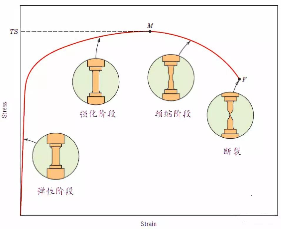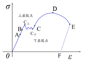 曲線較高點(diǎn)所對(duì)應(yīng)的應(yīng)力值記作,稱為材料的抗拉強(qiáng)度,它是衡量材料強(qiáng)度的又一個(gè)重要指標(biāo)。