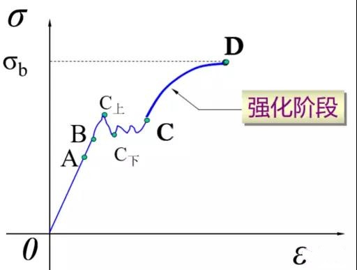 經(jīng)過屈服階段后,曲線從C點(diǎn)又開始逐漸上升,說明要使應(yīng)變?cè)黾?,就要增加?yīng)力,材料又恢復(fù)了抵抗變形的能力,這種現(xiàn)象稱作強(qiáng)化,CD段稱為強(qiáng)化階段(加工硬化)。