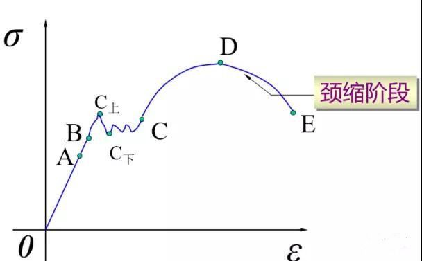 曲線到達(dá)D點(diǎn),在試件比較薄弱的某一局部(材質(zhì)不均勻或有缺陷處),變形顯著增加,有效橫截面急劇減小,出現(xiàn)了縮頸現(xiàn)象。此后,試件的軸向變形主要集中在頸縮處,試件在頸縮處被拉斷。