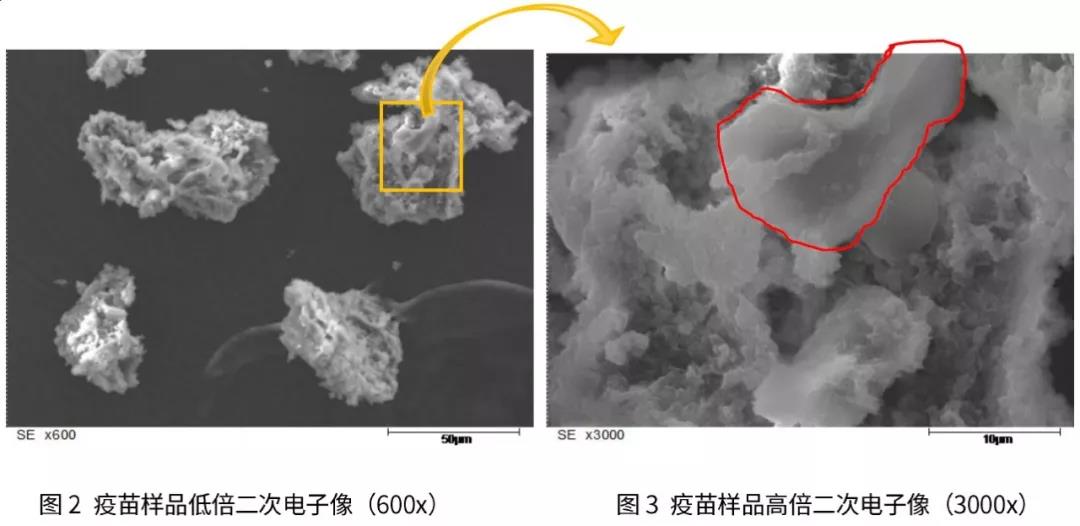 對圖2黃色方框標示位置在更大倍數(shù)(3000x)進一步觀察疫苗顆粒的微觀細節(jié),結(jié)果如圖3所示;顆粒清晰可見,在大塊狀顆粒(紅色線條內(nèi))周圍包裹有大量絮狀物。對圖3大塊狀顆粒(紅色線條內(nèi))進行微區(qū)成分定性分析,定性譜圖如圖4所示。