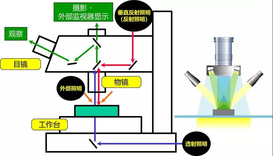 垂直照射測量物表面,適用于金屬、印刷電路板、淺孔的表面觀察。