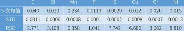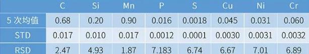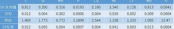 采用均勻性較好的塊狀低合金鋼標(biāo)準(zhǔn)樣品,在激發(fā)孔徑Ф2mm情況下,連續(xù)激發(fā)樣品10次,得到分析結(jié)果如下表。從分析數(shù)據(jù)可以看出,該試驗(yàn)方法的短期準(zhǔn)確度能夠達(dá)到直讀光譜儀正常樣品精度要求的精度以內(nèi)。