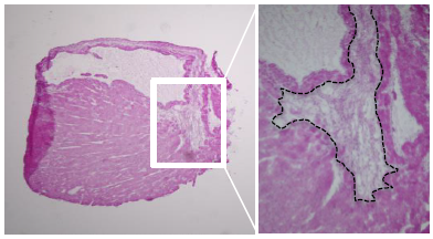 圖2所示為連續(xù)切片的蘇木精伊紅染色結(jié)果,檢測(cè)出心肌梗塞的區(qū)域(以黑線標(biāo)出)。