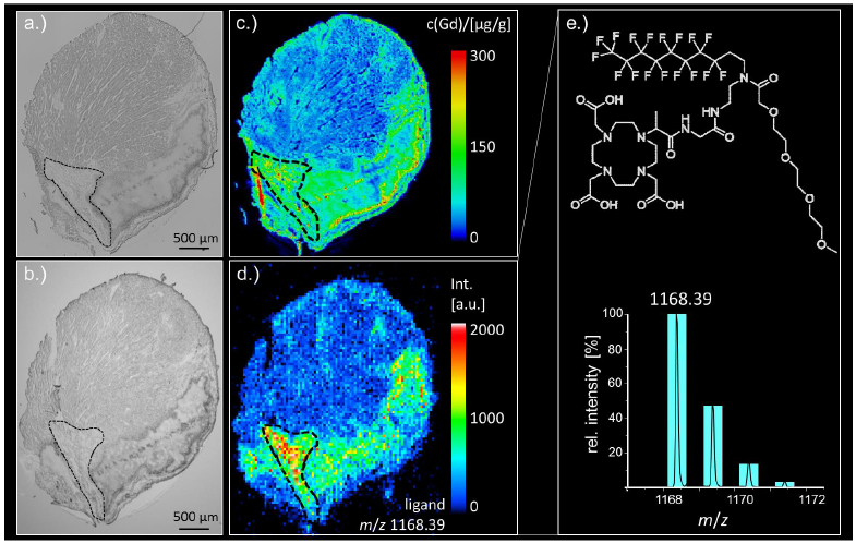 這些分布可以通過MALDI-MS成像進(jìn)行驗(yàn)證(d.)。該實(shí)驗(yàn)中,只能檢測(cè)到Gadofluorine P的質(zhì)子化配體,而不是完整的復(fù)合物(e.)。結(jié)果顯示,主峰m/z 1168.39的質(zhì)譜成像圖與LA-ICP-MS檢測(cè)的Gd分布具有良好的相關(guān)性。在心機(jī)梗塞和心室區(qū)發(fā)現(xiàn)了分子探針的zui高強(qiáng)度,而健康心肌則顯示出低而均勻的強(qiáng)度。