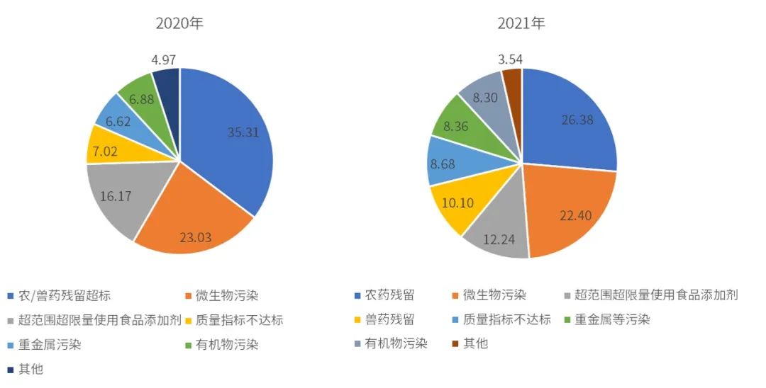 2020年和2021年食品抽檢中檢出不合格類(lèi)別樣品在不合格樣品總量中的占比